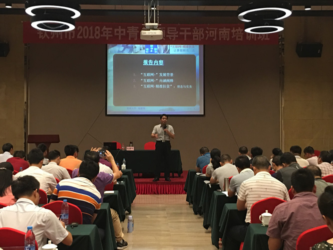 2018年7月23日下午,张建华教授为广西壮族自治区钦州市2018年中青年领导干部河南培训班,做题为《互联网+精准扶贫:让梦想照亮三农》的专题讲座。讲座内容包括:“互联网+”发展背景、“互联网+”内涵阐释、 “互联网+精准扶贫”:理念与实务(聚焦中央一号文件,“精准扶贫”的内涵解读,“精准扶贫”的突破口,“互联网+农业”内涵解析,“互联网+流通”助推农村电子商务发展,旅游扶贫内涵解析与实施策略,“互联网+精准扶贫”践行思路)等部分。