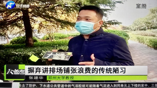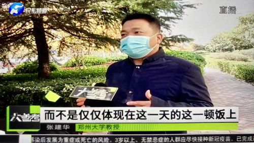 2022年11月14日上午,郑州大学张建华教授在盛和苑南门接受河南电视台记者采访,点评餐饮浪费问题。访谈于18日晚在河南电视台民生频道大参考栏目中播出。