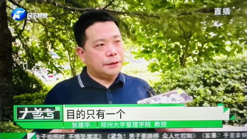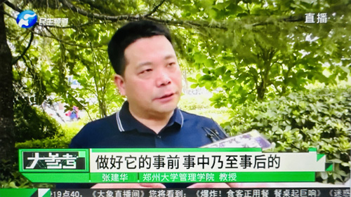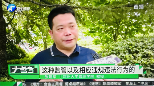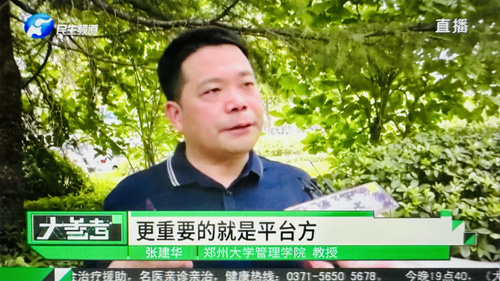 2023年7月11日上午,郑州大学张建华教授在盛和苑南门接受河南电视台记者采访,点评自媒体行业之有序发展。访谈于当晚在河南电视台民生频道大参考栏目中播出。