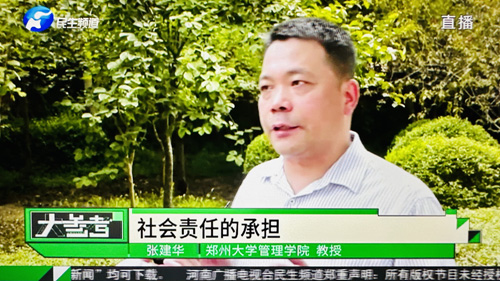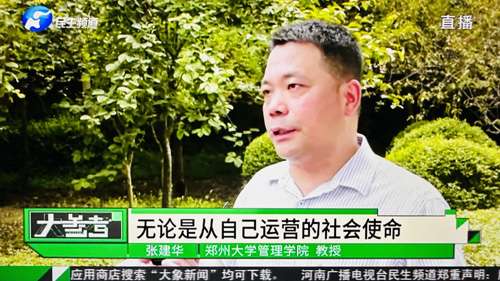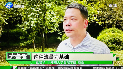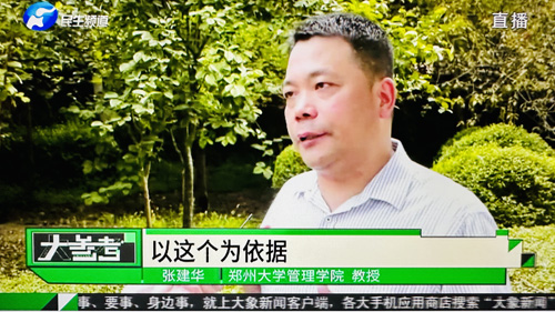 2023年7月31日中午,郑州大学张建华教授利用授课空挡在香缇湾酒店接受河南电视台记者采访,点评自媒体平台上靠“卖惨”博流量的行为。访谈于8月6日晚在河南电视台民生频道大参考栏目中播出。