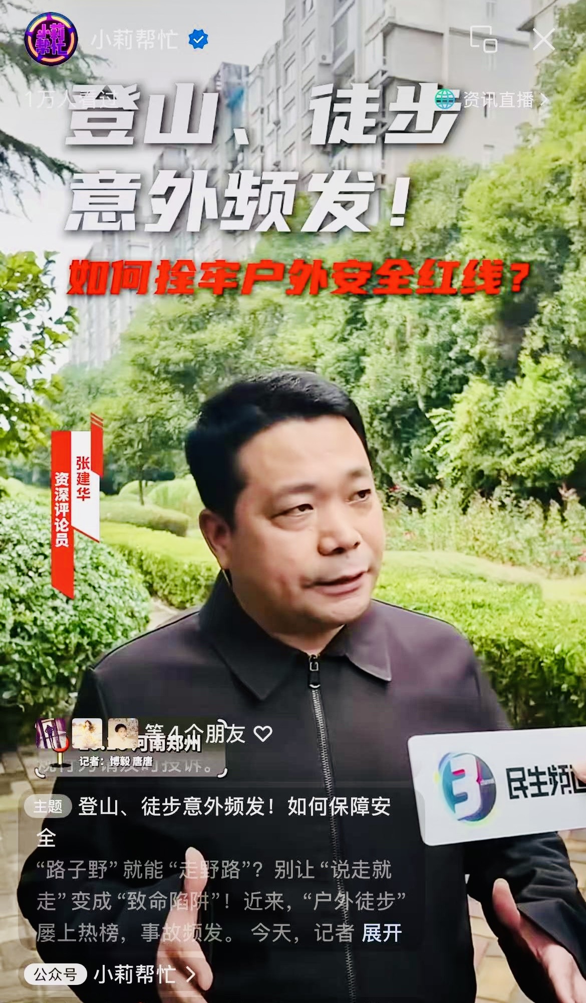 2025年10月16日,张建华教授在河南电视台,点评户外探险热背后的安全困局与治理之道。