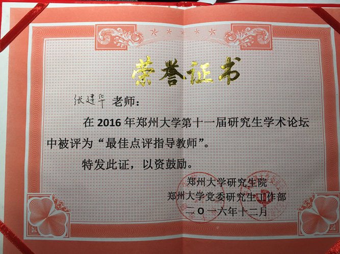 2017年1月6日下午,2016年郑州大学第十一届研究生学术论坛总结表彰大会,在郑州大学综合行政楼第二报告厅召开,张建华教授被评为“最佳点评指导教师”。