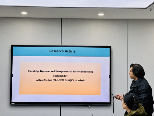 2025年11月23日晚,张建华教授主持召开研究生(硕士&博士)总第104次大人文交流暨2025-2026学年第一学期第5次学术交流会。会上,硕士生武天齐同学做了总第104次大人文演讲;博士生曹子傲同学演练了其博士学位答辩流程,隶属于Batch 4的博士生Noman、Aly、Shazat、Azmat、Maria、孙若男、张何赞、张科以及硕士生梁宏做了学术汇报。会后,张教授继续解答了部分同学的研究问题。会前,Shanza Qayyum、白嫣红同学有请假。